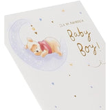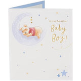 - Say hello to the new baby boy with this cute Disney Winnie the Pooh card, embossed with gold foil. It is illustrated with Pooh bear asleep on the moon.