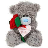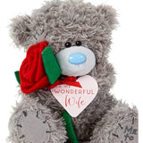 - Official Me to You bear is holding a red fabric rose and a pink heart with the caption 'To My Wonderful Wife'