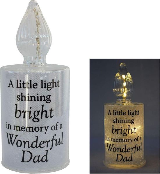 Honor the cherished memory of your Dad with this peaceful Memorial Candle Light. Engraved with heartfelt Wording that speaks to the enduring love for a father, this candle provides a gentle, flickering light, symbolizing his everlasting presence in your heart. It serves as a beautiful, tranquil tribute that helps create a moment of reflection, bringing warmth and comfort into your home during a difficult time. A perfect way to keep his light shining.