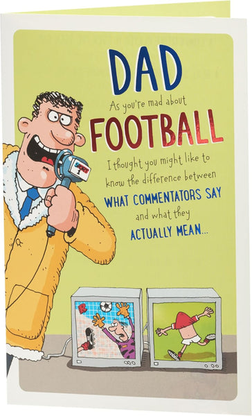 - This funny Father's Day card is perfect for any dad who loves football, whilst making fun of the difference between what commentators say and what they really mean.