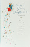 - Dual Presents Theme – Festive card featuring cheerful illustrations of Christmas presents, expressing warm wishes for both a son and daughter-in-law.
