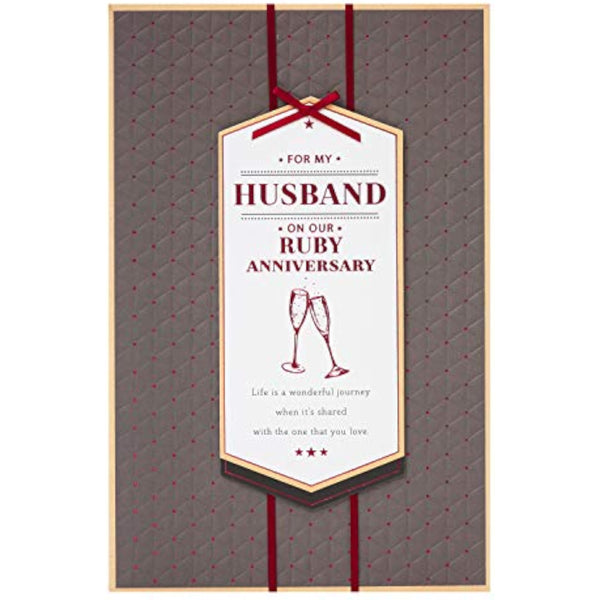 • As you celebrate 40 wonderful years of marriage let your husband know just how much he means to you with this luxury hand finished anniversary card complete with red ribbons and romantic message