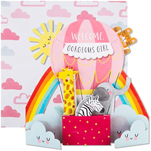 - Printed on high-quality die-cut board to create a fantastic pop-out pink air-balloon feature with watercolour-styled animal illustrations; the card comes complete with a coordinating Pink Cloud Patterned Hallmark Branded Envelope